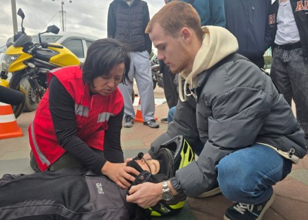 Для наглядности и большей реалистичности организаторы смоделировали ДТП с участием мотоциклиста, автомобиля и пешехода. Помогли в этом активисты из сообщества Motogymkhana Ekaterinburg team. Эффект усилили грим и искусственная кровь на теле условных пострадавших. Желающих учили проводить непрямой массаж сердца и искусственное дыхание, накладывать шину, правильно снимать шлем с пострадавшего мотоциклиста и доставать его из-под байка. Отработать полученные навыки можно было на специальных фантомах.