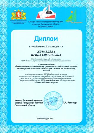 Диплом Министерства физической культуры, спорта и молодежной политики Свердловской области: