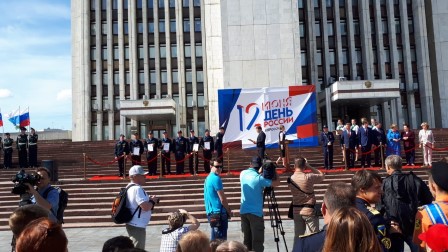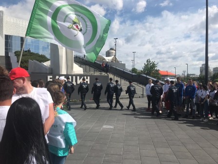 Праздник начался с торжественного построения для вручения Губернатором Свердловской области Евгением Куйвашевым флагов России представителям общественных организаций Свердловской области, среди которых были общественные объединения, действующие на базе нашего колледжа: